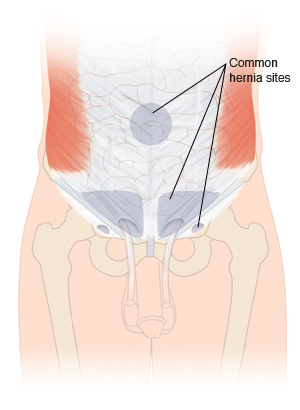 A hernia can happen when there is a weakness or defect in the wall of the abdomen or groin. Intestines or nearby tissues may move from their usual location and push through the weakness in the wall. This can cause a bulge (hernia) you may see or feel.